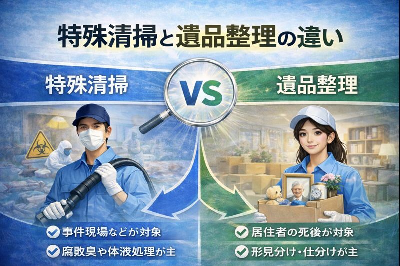 | **最優先事項** | 除菌、消臭、害虫駆除(衛生) | 仕分け、貴重品捜索(相続・供養) |